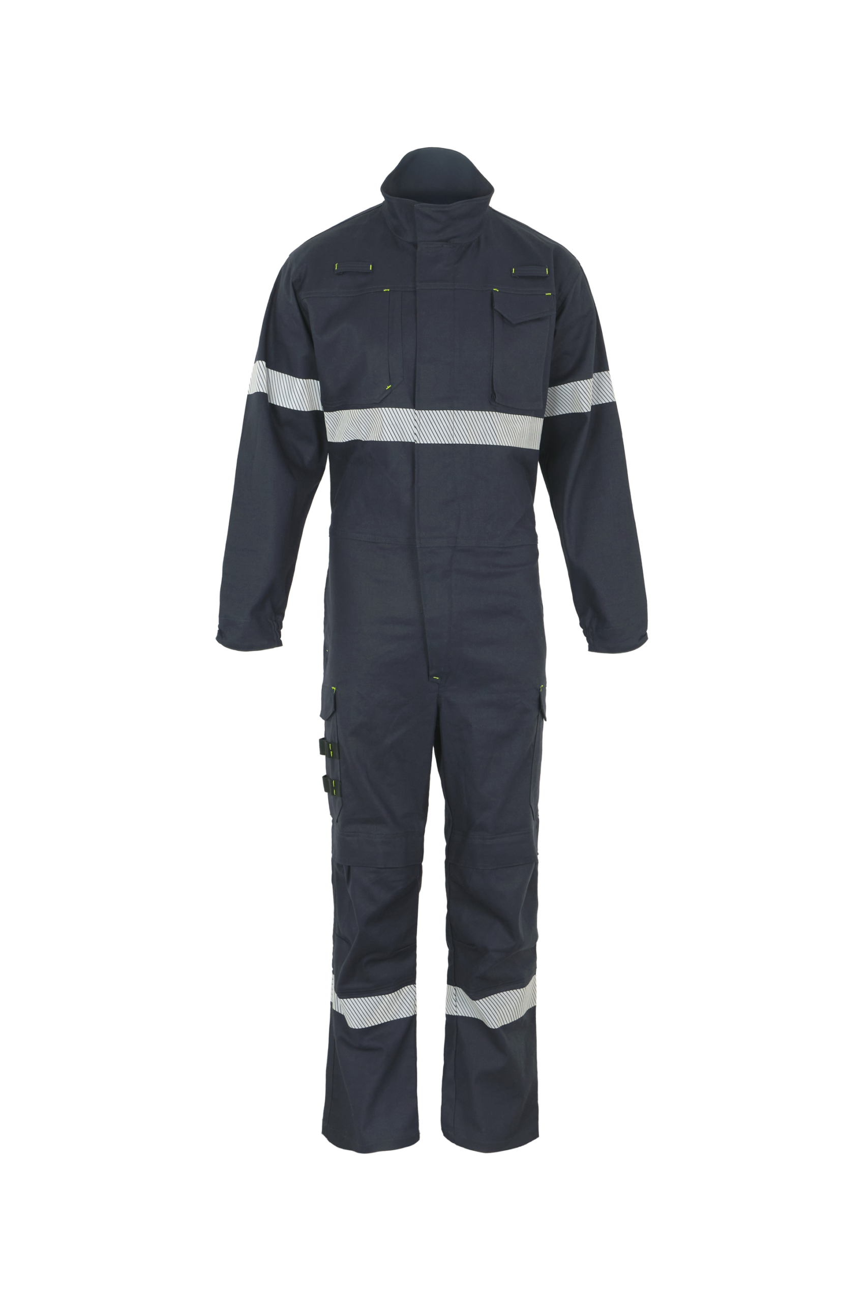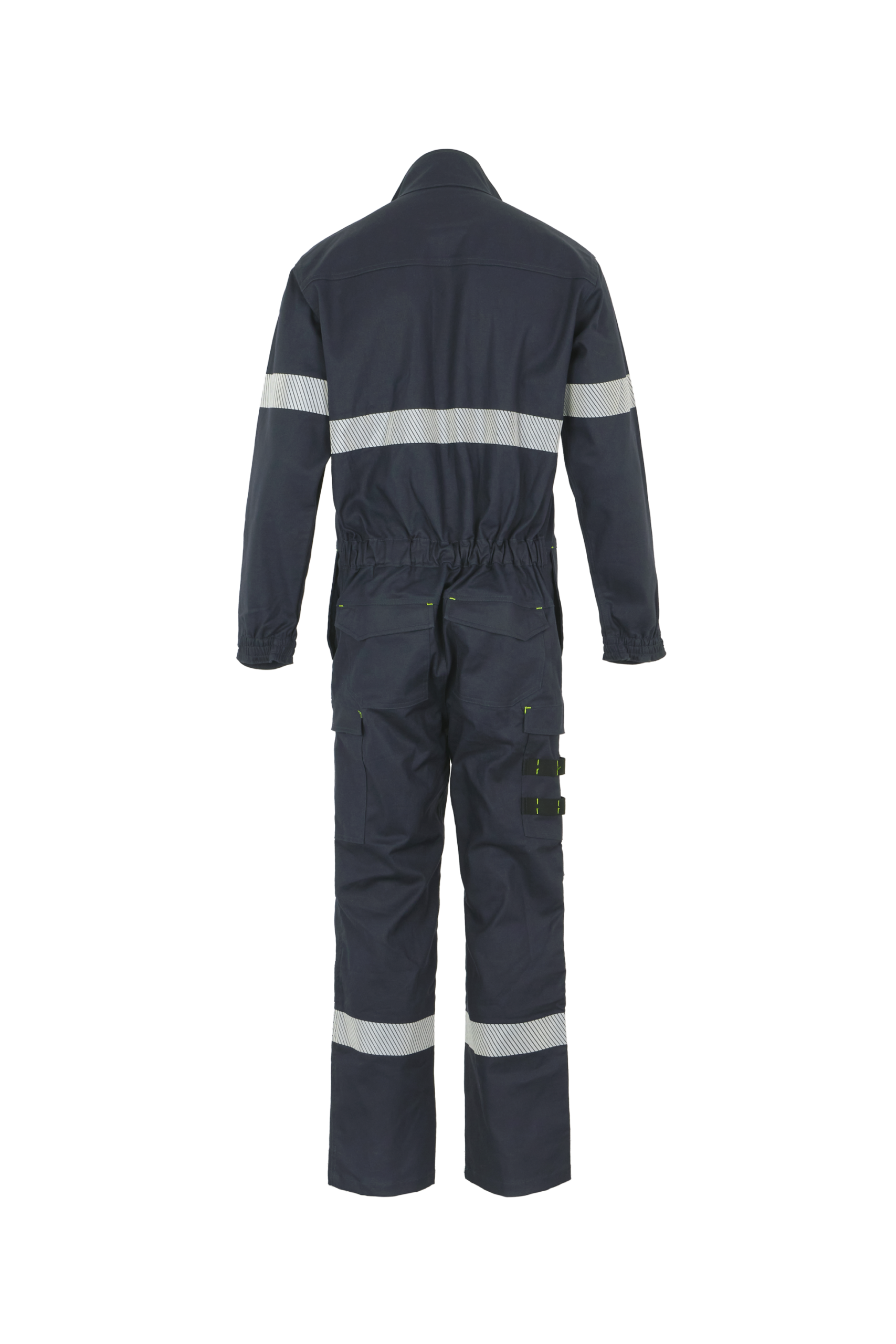 Buzo de trabajo sin elementos metálicos, con cierre frontal bajo tapeta y cabillos para emisoras. Incorpora bolsillos superiores y de pernera, cintura trasera elástica y bolsillos traseros con tapeta. Rodillas preformadas y reforzadas permiten insertar rodilleras. Presenta cuello alto, puños elásticos, refuerzos tipo remache y una banda reflectante gris segmentada y termoadhesiva.