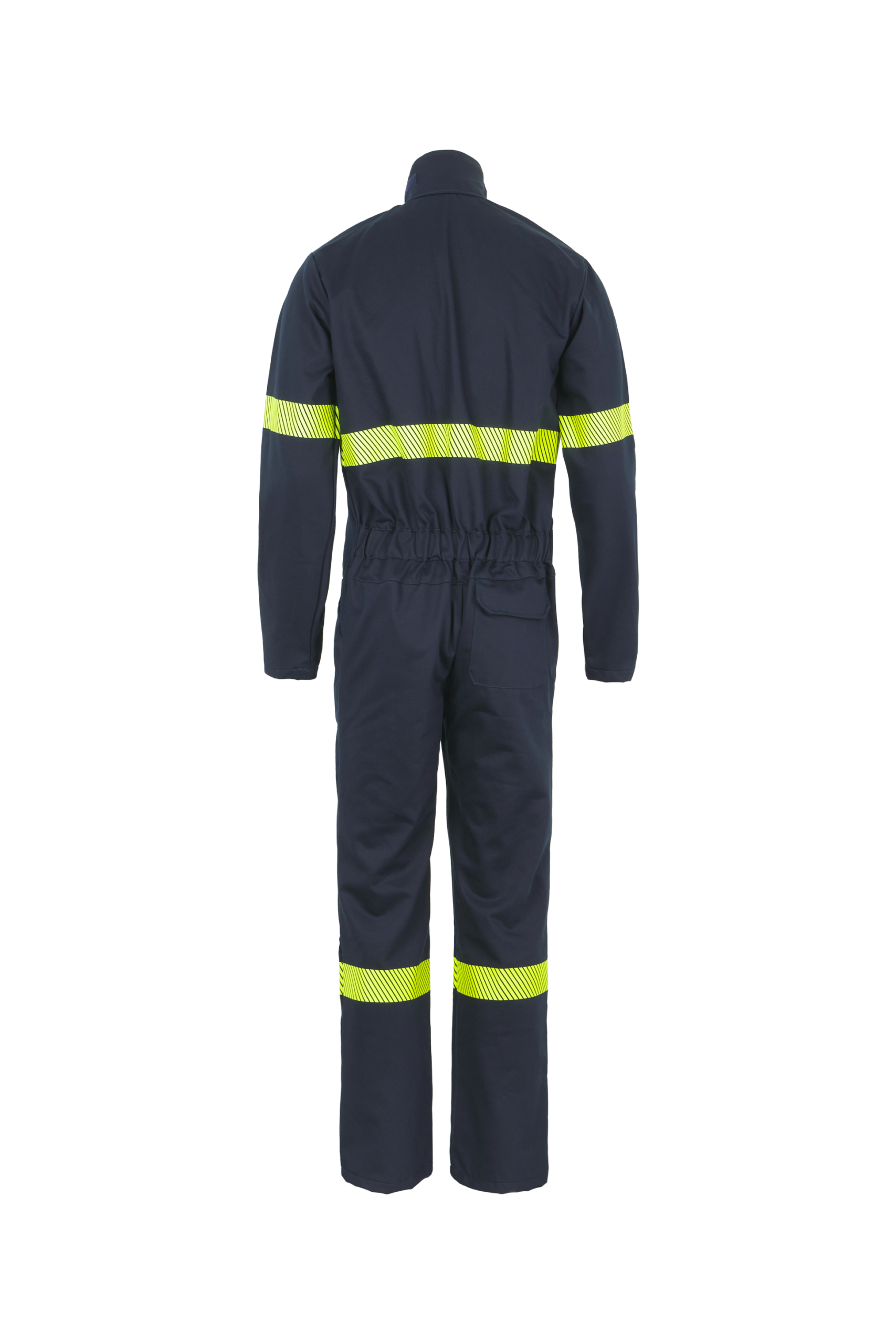 El buzo de trabajo ofrece cierre frontal con cremallera y tapeta con velcro, cuello camisero, cintura elástica trasera, un bolsillo superior y dos inferiores con tapeta y velcro, y puños ergonómicos con goma.