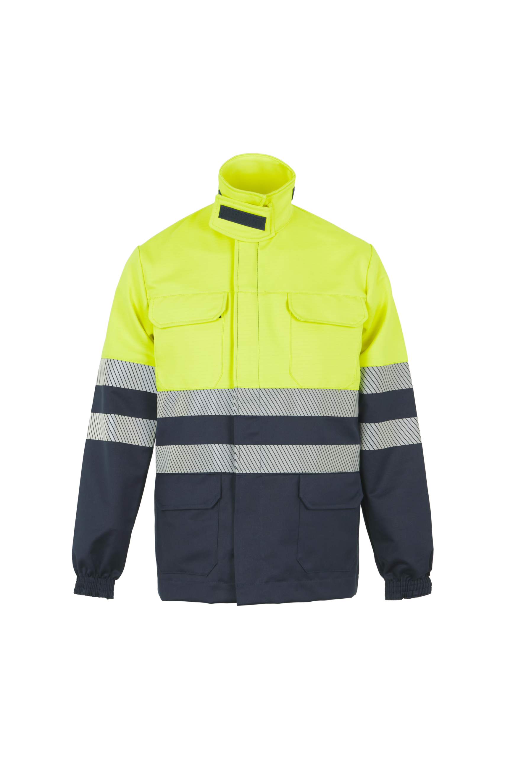 La chaqueta Cromo FO Alta Visibilidad incluye cierre frontal con cremallera y velcro, alzacuellos, puños elásticos y cuatro bolsillos, también con diseño bicolor y cintas reflectantes.