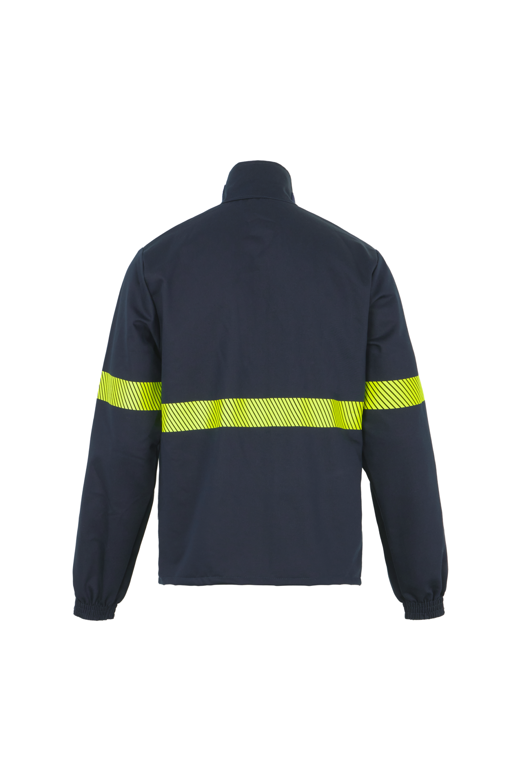 La chaqueta de trabajo incorpora cierre frontal con cremallera y tapeta con velcro, cuello camisero, dos bolsillos superiores y dos inferiores con tapeta y velcro, y puños elásticos que mejoran el ajuste.