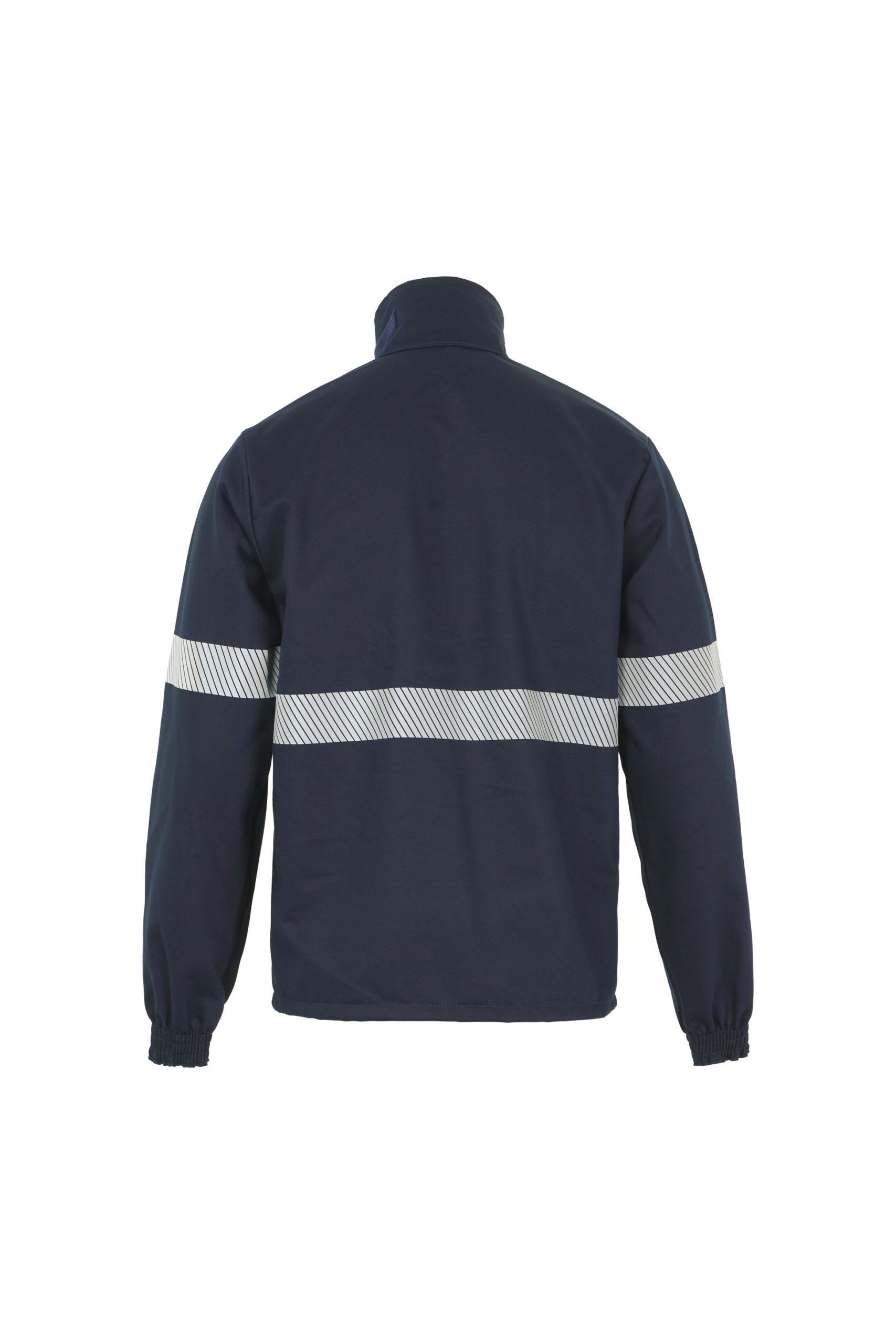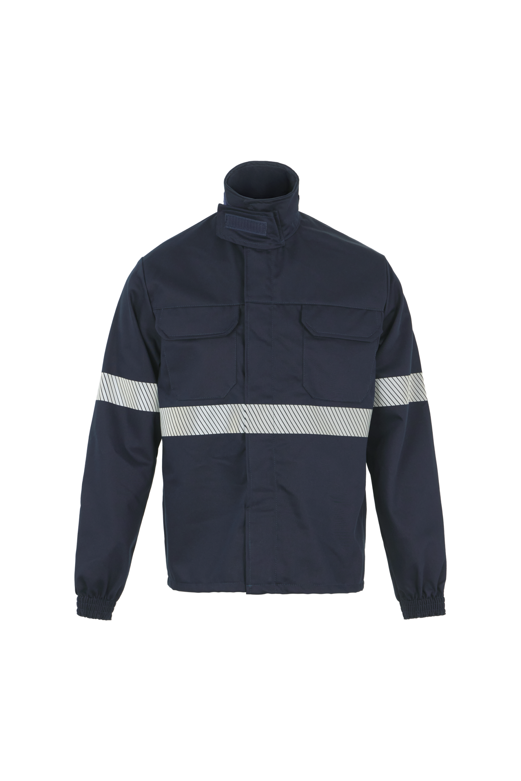 La chaqueta de trabajo incorpora cierre frontal con cremallera y tapeta con velcro, cuello camisero, dos bolsillos superiores y dos inferiores con tapeta y velcro, y puños elásticos que mejoran el ajuste.