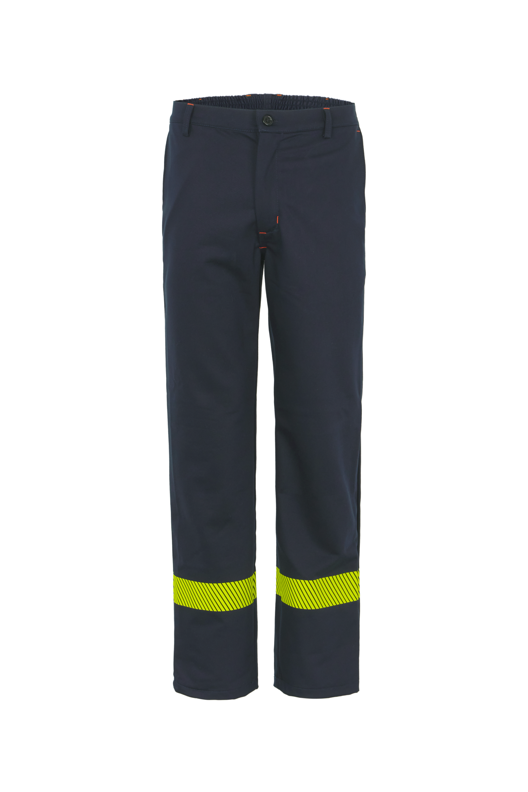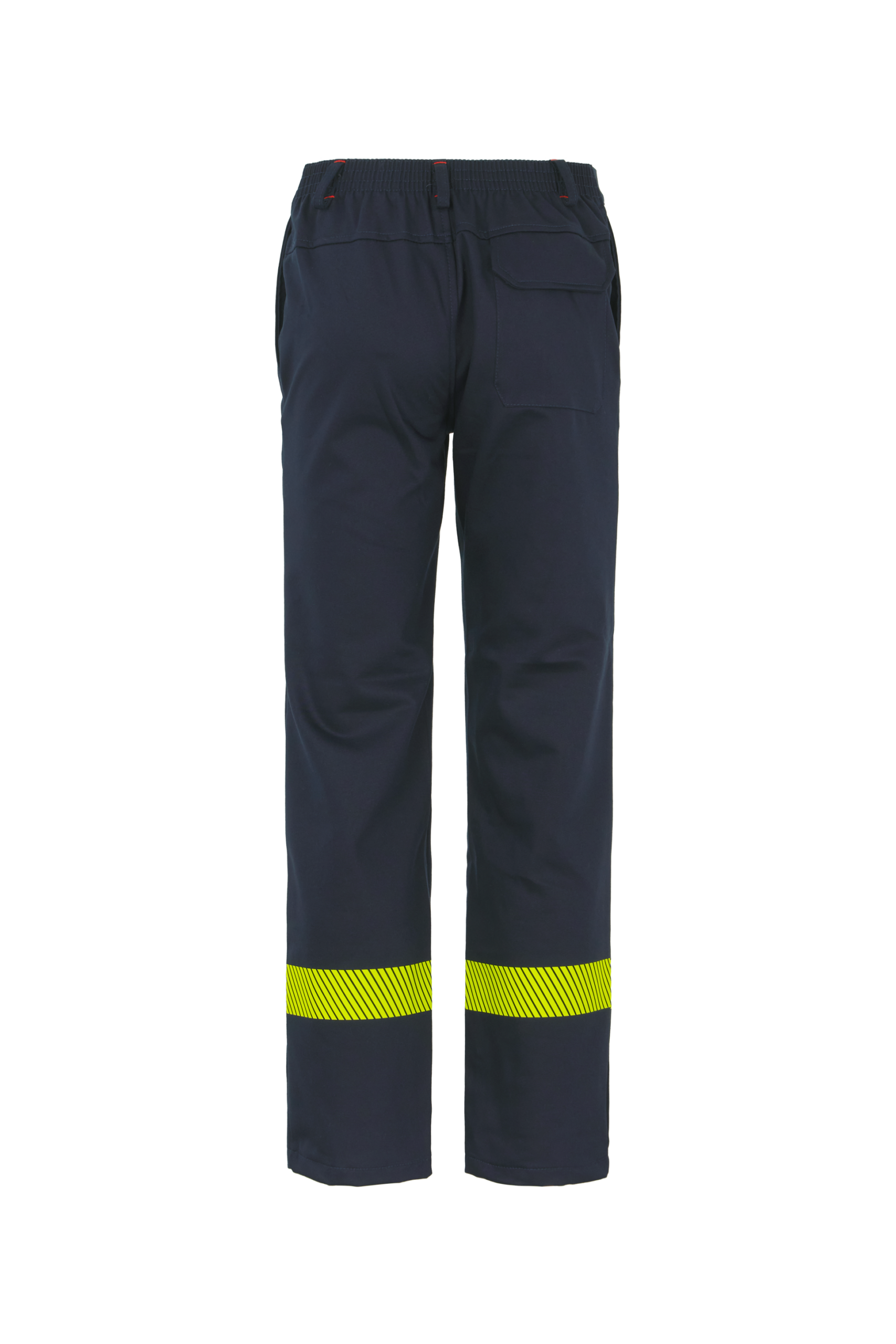 El pantalón de trabajo incluye cierre con cremallera y botón, cintura elástica trasera, dos bolsillos tipo francés, un bolsillo trasero y un bolsillo lateral en pernera, todos con tapeta y velcro.
