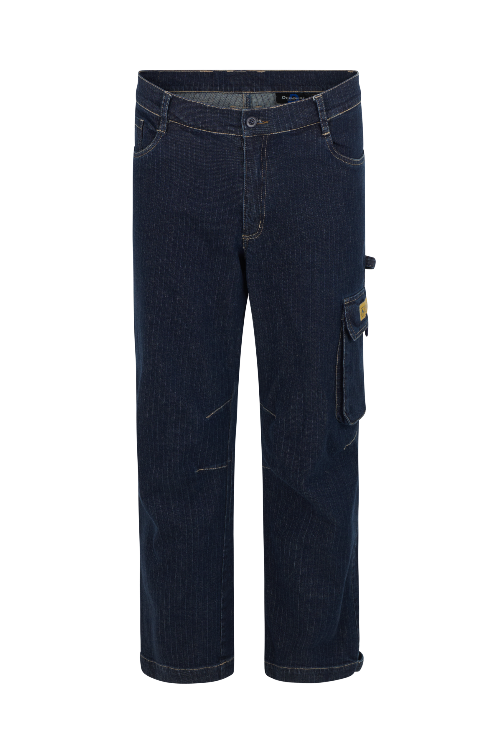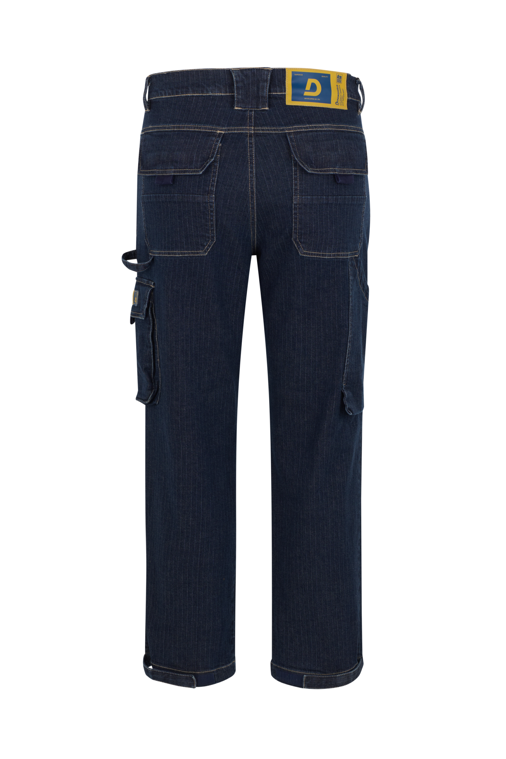 Pantalón denim con rodillas preformadas. Incorpora cierre de cremallera y botón, sin elementos metálicos. Los bolsillos delanteros, cumplen los requisitos frente a salpicaduras de metal fundido. La pernera incorpora otro bolsillo con fuelle, tapeta y cierre velcro, junto con trabilla portaherramientas y bolsillo cuchillero. Bolsillos traseros con tapeta. Hilo beige a contraste.