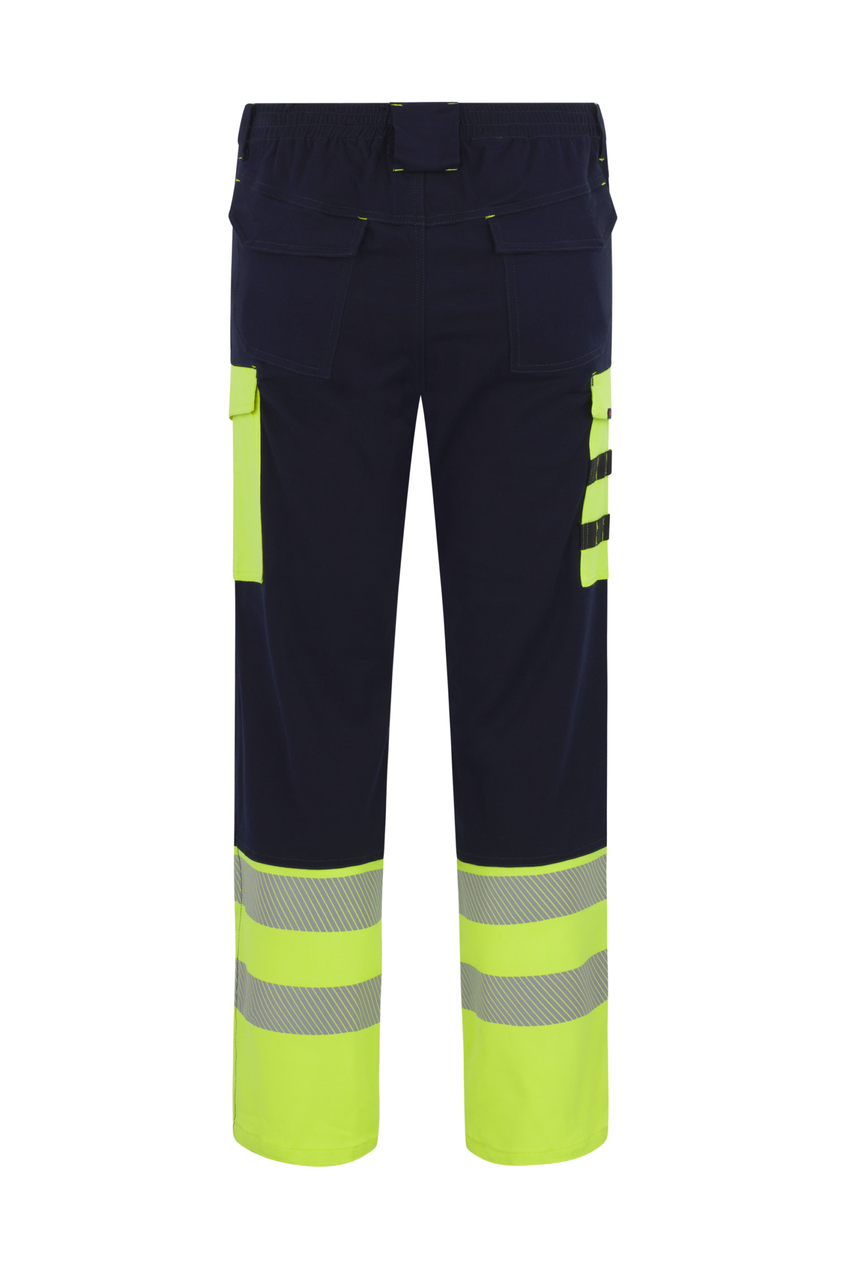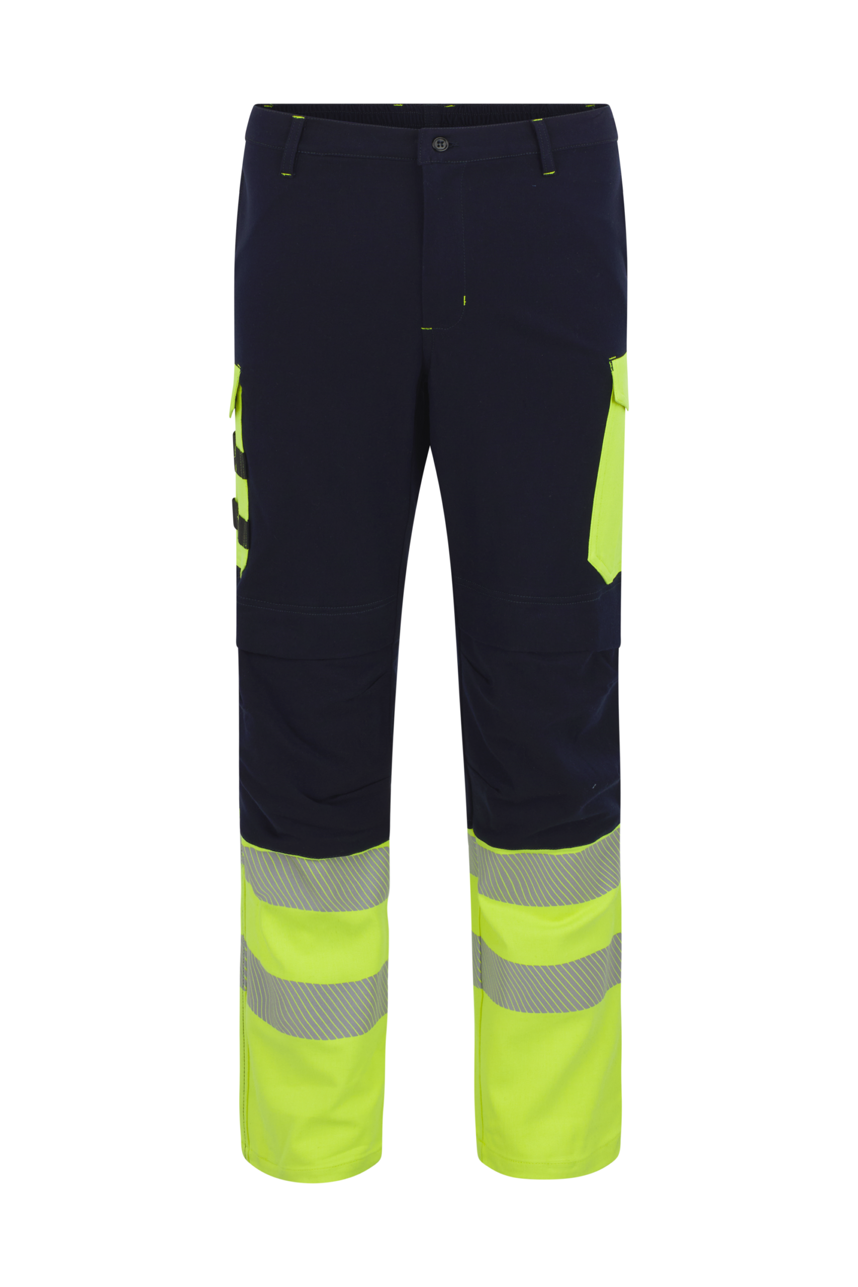 Pantalón con cierre de cremallera y botón sin elementos metálicos, cintura trasera elástica y múltiples bolsillos funcionales: delanteros tipo francés, traseros con tapeta y velcro y bolsillos de pernera en amarillo de alta visibilidad, uno con fuelle y otro con cintas portaherramientas. La parte inferior incorpora bandas reflectantes segmentadas y rodillas preformadas para rodilleras interiores.