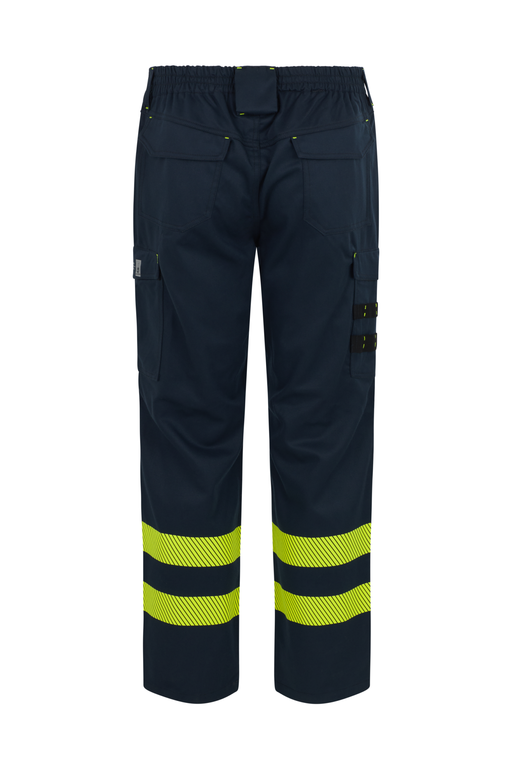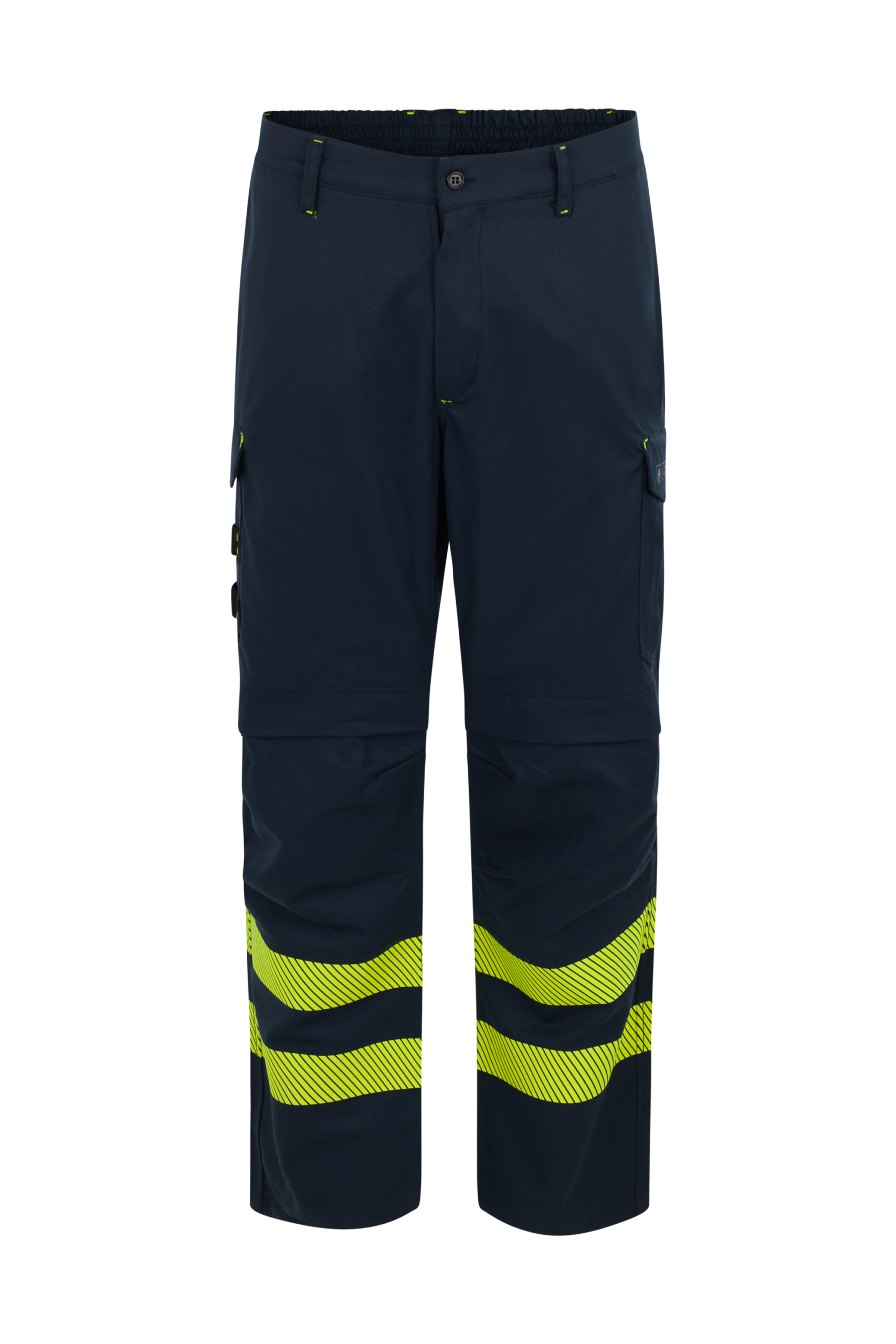 Pantalón con cierre de cremallera y botón sin elementos metálicos, cintura trasera elástica y múltiples bolsillos funcionales: delanteros tipo francés, traseros con tapeta y velcro, y bolsillos de pernera con fuelle o cintas portaherramientas. Incorpora dos bandas amarillas de alta visibilidad termo‑adhesivas y rodillas preformadas y reforzadas para insertar rodilleras.